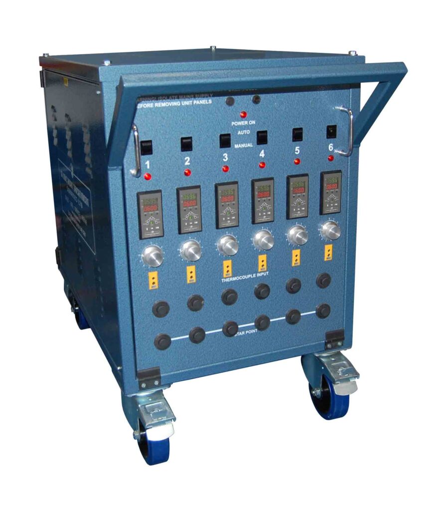 This 50kVA six control channel unit, utilises six P159TDA temperature controller/programmers, to provide power and temperature control of up to eighteen ceramic pad heating elements rated at 65V, 45A, 2.7kW. This controlled power is used for preheating or post weld heat treatment of pipe welds, fabrication welds and other fabrications requiring controlled heating.