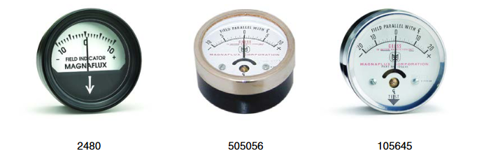 The Magnetic Field Indicators, also known as gauss meters or magnetometers, are used to check residual magnetism after magnetic particle testing. They read the amount of residual magnetism left in a part quickly when the indicator arrow is placed against a magnetized part. The field indicators are available in both general purpose and non-calibrated and calibrated models and can be re-calibrated through Magnaflux.